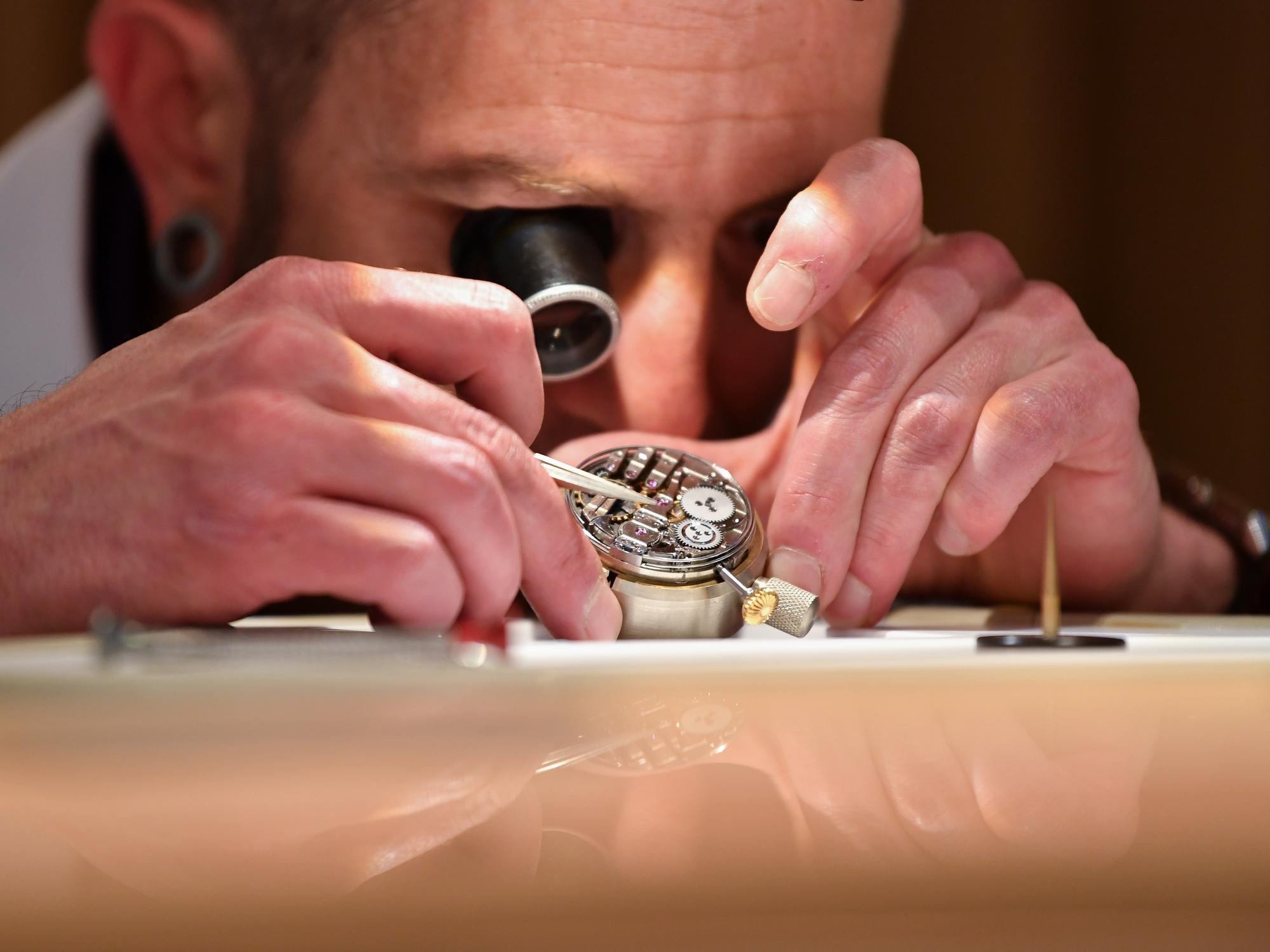 2025年4月1日,在瑞士日内瓦举行的“钟表与奇迹”高级钟表展上,工匠展示钟表修复工艺。新华社记者连漪摄